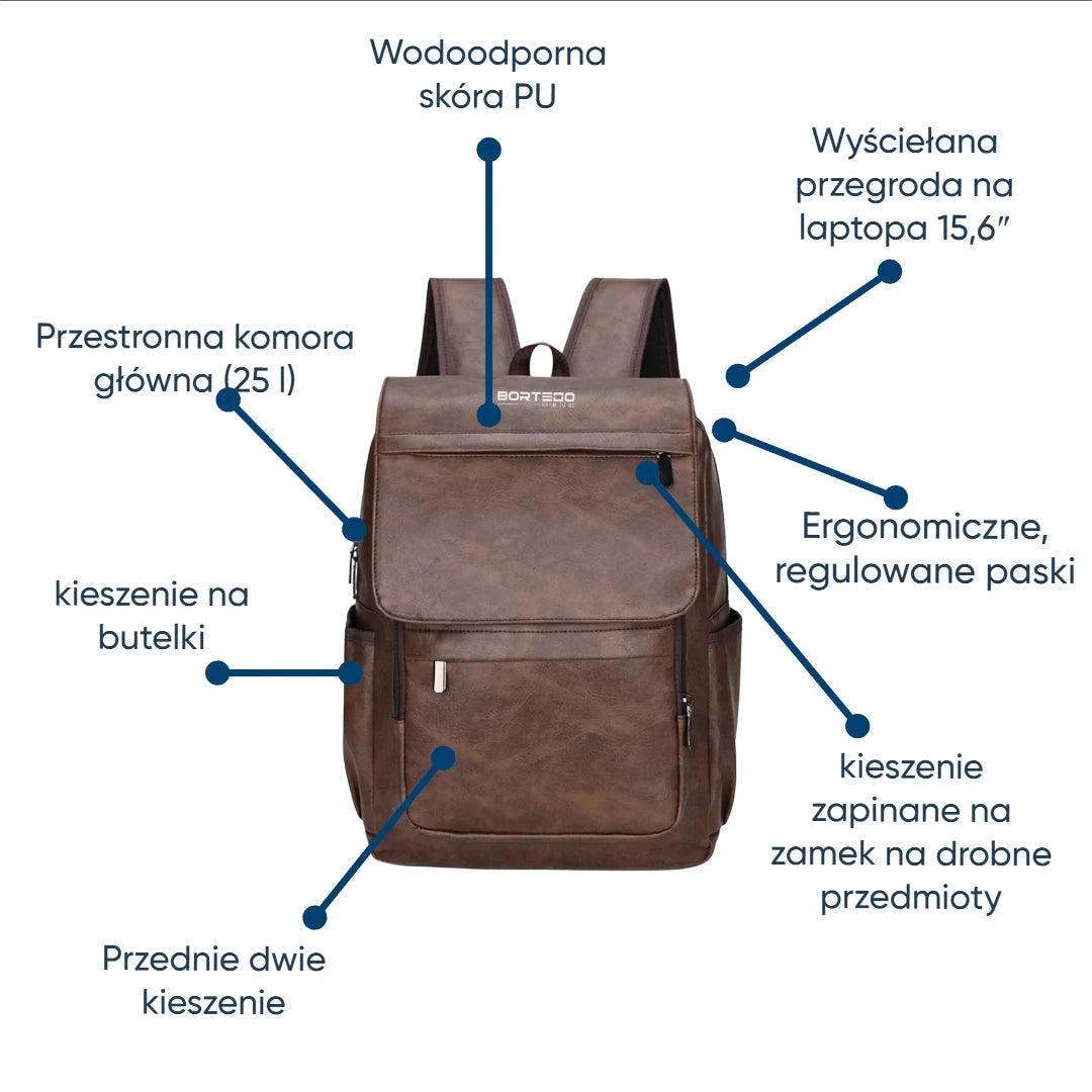 Specjalna przegroda na laptopa 15,6" , ukryte kieszenie i ergonomiczne paski zapewniają bezpieczeństwo i wygodę zarówno w pracy, na uczelni, jak i podczas zwiedzania miasta. Jego minimalistyczny krój i przemyślane detale sprawiają, że jest to coś więcej niż zwykły plecak — to wyraz stylu i pewności siebie.